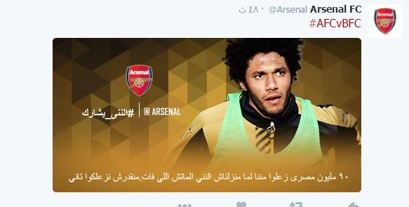 ونشر الحساب الرسمي لآرسنال، صورة للنجم المصري المحترف ضمن صفوف الفريق، وعلقوا أسفلها بتلك العبارة " 90 مليون مصري زعلوا مننا لما منزلناش #النيني الماتش الي فات ، منقدرش نزعلكوا تاني "
