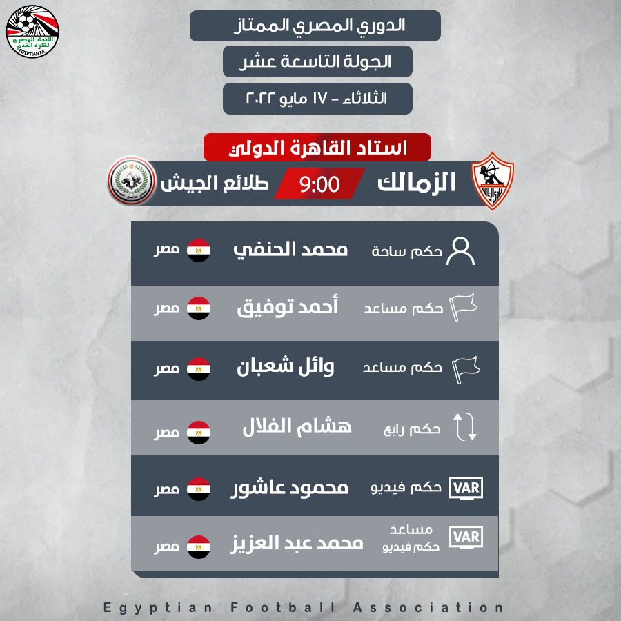 أعلنت لجنة الحكام باتحاد الكرة عن طاقم تحكيم مباراة الزمالك وطلائع الجيش المقرر إقامتها الثلاثاء ضمن منافسات بطولة الدوري المصري.