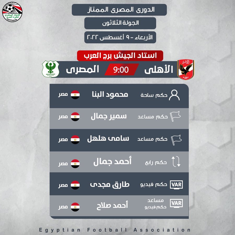 قررت لجنة الحكام تعيين محمود البنا حكمًا لمباراة الأهلي والمصري، على أن يعاونه كل من سمير جمال "مساعد أول"، سامي هلهل "مساعد ثان".