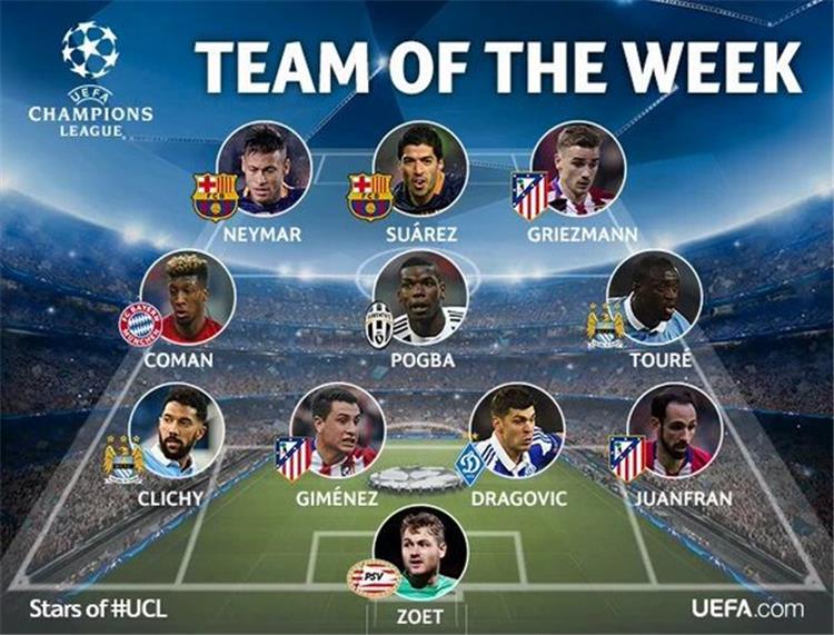 في الدفاع: كليشي "مانشستر سيتي الانجليزي"، خيمينيس "أتليتكو مدريد الاسباني"، دراجوفيتش "دينامو كييف الاوكراني"، خوانفران "أتليتكو مدريد الاسباني".