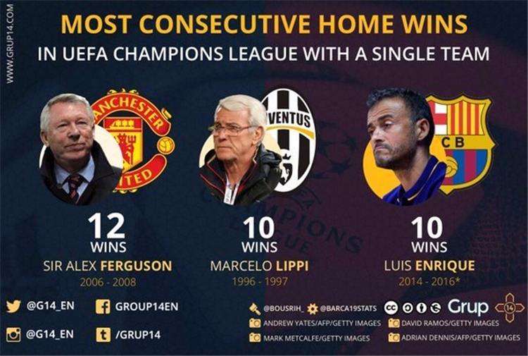 حقق انريكي 10 انتصارات متتالية على أرضه في دوري أبطال أوروبا في الفترة من 2014 إلى 2016، ولو فاز غدا سيتخطى انريكي، المدرب الايطالي المخضر السابق لفريق يوفنتوس مارشيلو ليبي الذي حقق 10 انتصارات متتالية على أرضه في موسم 1996 -1997.