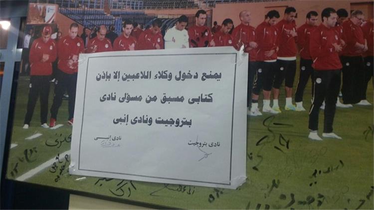 وعلق المسؤولون، ورقة مكتوب عليها "ممنوع دخول وكلاء اللاعبين، إلا بإذن من مسئولي بتروجيت وإنبي".