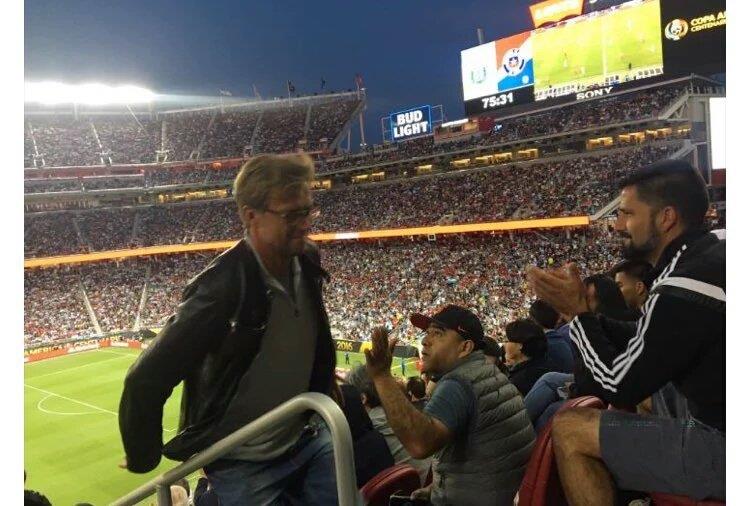 ألتقطت صورة للألماني يورجن كلوب مدرب ليفربول الإنجليزي في الولايات المتحدة الأمريكية، أثناء مشاهدته لمباراة المنتخب الأرجنتيني أمام نظيره الشيلي، خلال بطولة كوبا أمريكا، وكان مع شقيق ووكيل أعمال المهاجم جونزالو هيجواين.