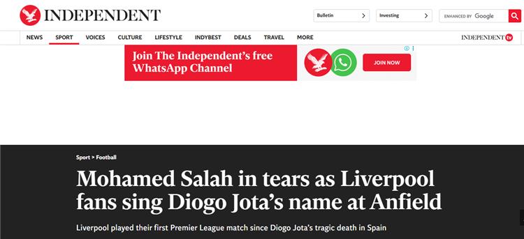 صحيفة "إندبندنت" قالت: "محمد صلاح يبكي خلال غناء جماهير ليفربول نشيد ديوجو جوتا في أنفيلد"