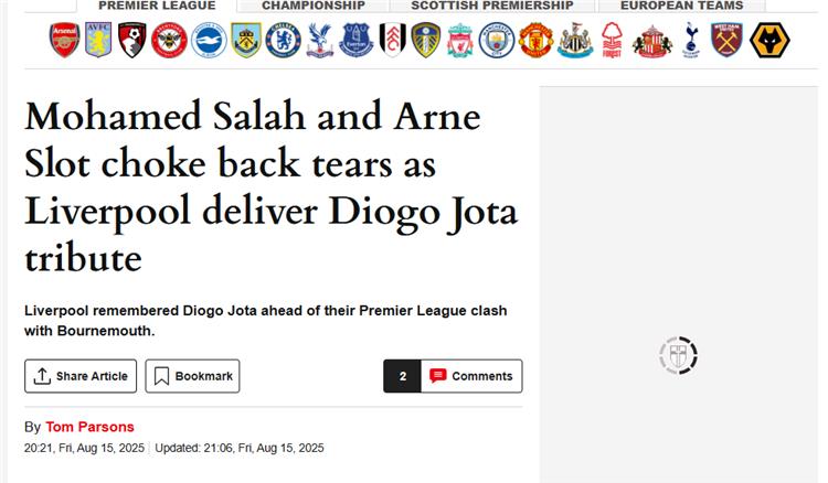 صحيفة "ديلي ميل" قالت: "محمد صلاح ينهار بالبكاء بينما يكرم ليفربول ديوجو جوتا عاطفيًا ويهدي النجوم الأهداف لزميلهم الراحل في فوز بورنموث".