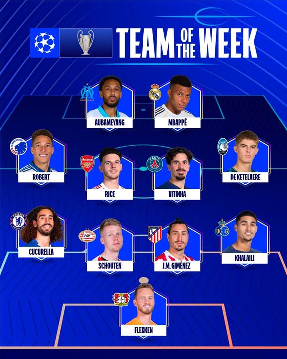 ويقود التشكيل المثالي النجم الفرنسي لنادي ريال مدريد كيليان مبابي الذي سجل سوبر هاتريك، خلال فوز فريقه برباعية لثلاث اهداف أمام أولمبياكوس اليوناني.