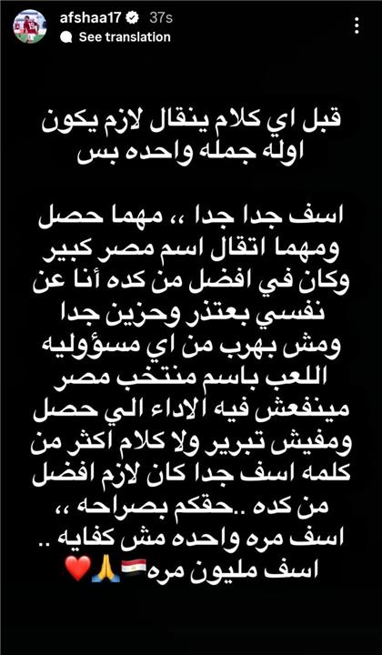 وأضاف::آسف جدًا جدًا، مهما حصل ومهما اتقال اسم مصر كبير وكان فيه أفضل من كده أنا عن نفسي بعتذر وحزين جدًا ومش بهرب من أي مسؤولية".