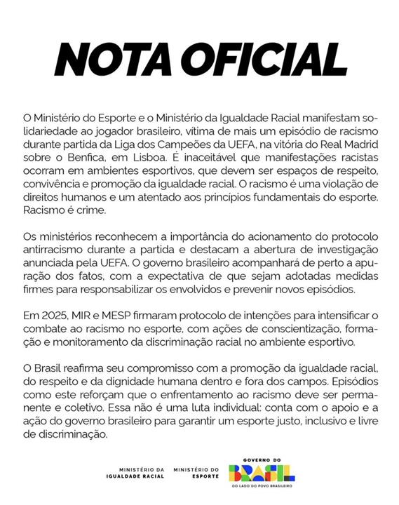 وجاء بيان حكومة البرازيل على النحو التالي: "أعربت وزارة الرياضة ووزارة المساواة العرقية عن تضامنهما مع فينيسيوس وهو ضحية حلقة جديدة من العنصرية خلال مباراة دوري أبطال أوروبا".