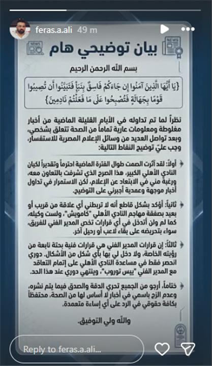 وأضا: "أولاً: لقد أثرت الصمت طوال الفترة الماضية احترامًا وتقديرًا لكيان النادي الأهلي الكبير، هذا الصرح الذي تشرفت بالتعاون معه ورغبة مني في الابتعاد عن الإعلام، لكن الاستمرار في تداول أخبار موجهة وعمدية أجبرني على التوضيح".