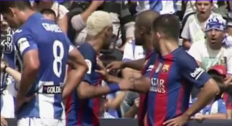 ألتقطت عدسات الكاميرات خلال مباراة برشلونة أمام ليجانيس التي أقيمت ظهر، اليوم السبت، مشادة بين الثنائي البرازيلي للفريق الكتالوني " نيمار ورافينيا."