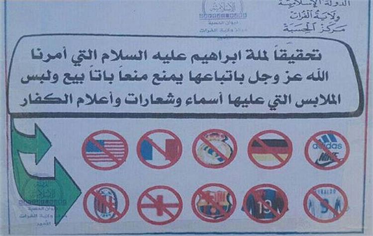 ونشرت صحيفة "ماركا" الأسبانية، نقلاً عن صحيفة "ميرور" الإنجليزية، صورة تحذير الجماعة الإرهابية، للعراقيين من إرتداء هذه الشعارات.