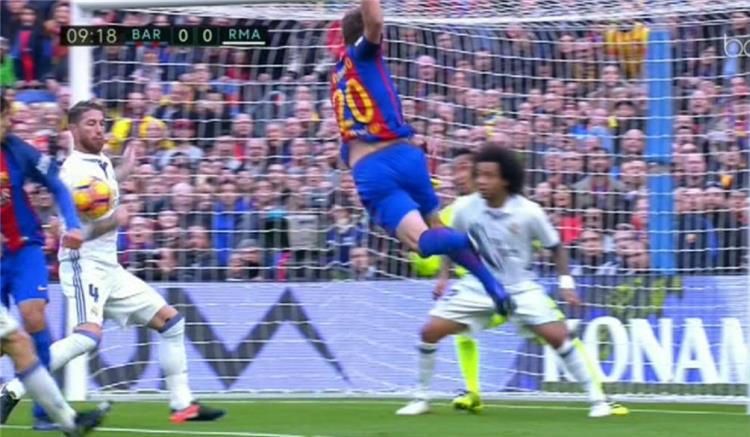 وشهدت الدقيقة 9 من الشوط الأول تسديدة قوية من جانب لاعب وسط برشلونة، جوميز، لتصطدم الكرة في يد راموس داخل منطقة الجزاء.