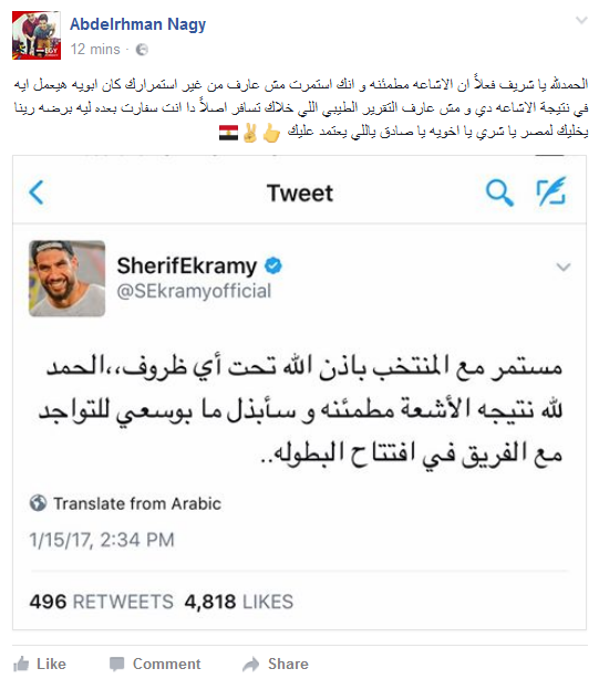 وكتب عبدالرحمن عبر حسابه الشخصي على موقع التواصل الاجتماعي "فيس بوك"، رد قاسي على إكرامي قائلاً: "الحمدلله يا شريف فعلاً ان الاشاعه مطمئنه و انك استمرت مش عارف من غير استمرارك كان ابويه هيعمل ايه في نتيجة الاشاعه دي ومش عارف التقرير الطيبي اللي خلاك تسافر اصلاً دا انت سفارت بعده ليه برضه رينا يخليك لمصر يا شري يا اخويه يا صادق ياللي يعتمد عليك".