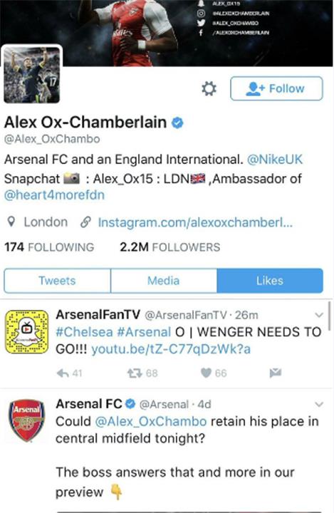 جاء ذلك بعد تداول صورة من حساب اللاعب الرسمي عبر موقع التواصل الإجتماعي تويتر، حيث أعجبه تغريده لأحد الحسابات الموالية لأرسنال وتطالب برحيل فينجر.
