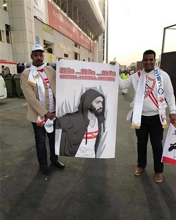 حرص مشجعو الزمالك، على حمل لافته تحمل صورة محمود عبدالرازق شيكابالا، صانع العاب الزمالك، خلال تواجدهم بإستاد محمد بن زايد، بمدينة أبوظبي بالإمارات.
