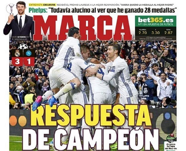 اهتمت الصحف الإسبانية بفوز ريال مدريد على نابولي الإيطالي بثلاثية في ذهاب ثمن نهائي دوري الأبطال.