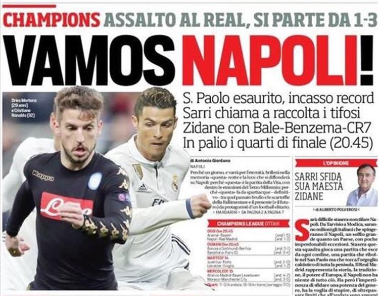 اهتمت الصحف الإيطالية بالحديث عن المواجهة المنتظرة بين مواطنها نابولي وريال مدريد الإسباني في إياب ثمن نهائي دوري الأبطال.
