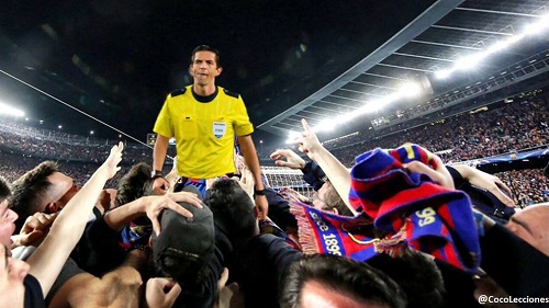 وأنطلق ميسي مباشرة يحتفل مع جماهير الفريق الكتالوني ليلتقط المصور المكسيكي تلك الصورة ونشرها على حسابه بموقع التواصل الإجتماعي سناب شات، إلا أن الجماهير تداولت الصورة بطريقة ساخرة وأستبدلت ميسي بالحكم الألماني دينيس أيتيكين الذي أدار اللقاء، وأثار الجدل ببعض قرارته،في إشارة إلى أنه ساهم في فوز برشلونة بالمباراة ويحتفل بالفوز مع جماهير الفريق الكتالوني،وهو ما نشرته صحيفة (ماركا) الإسبانية.