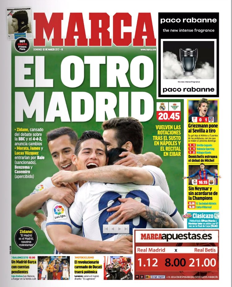 اهتمت الصحف الإسبانية بعودة برشلونة للمشاركة في الليجا بعد العودة التاريخية الذي حققها أمام باريس سان جيرمان الفرنسي بدوري الأبطالـ بالإضافة إلى الخطة المتوقعة لريال مدريد أمام بيتيس.