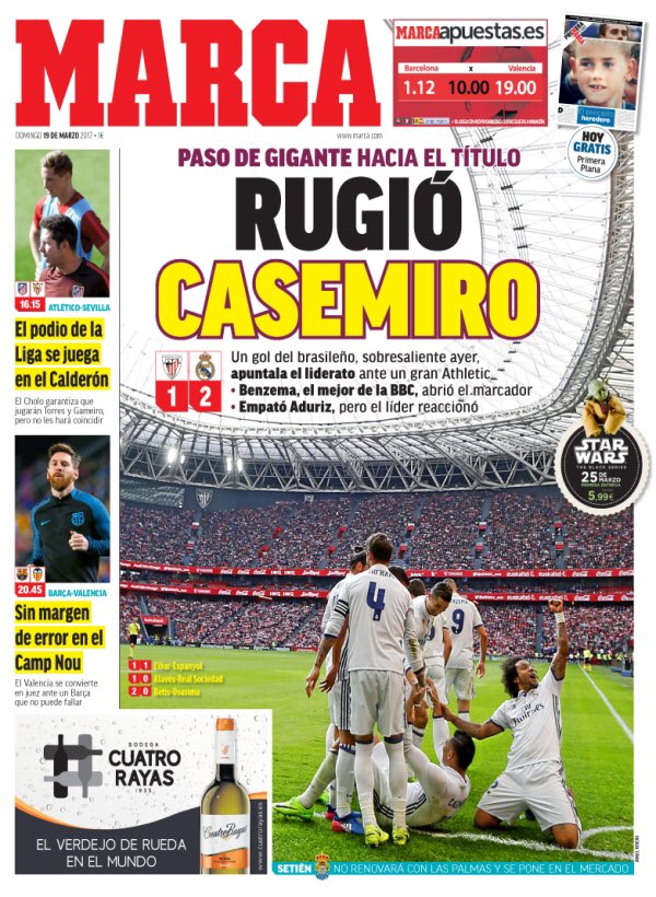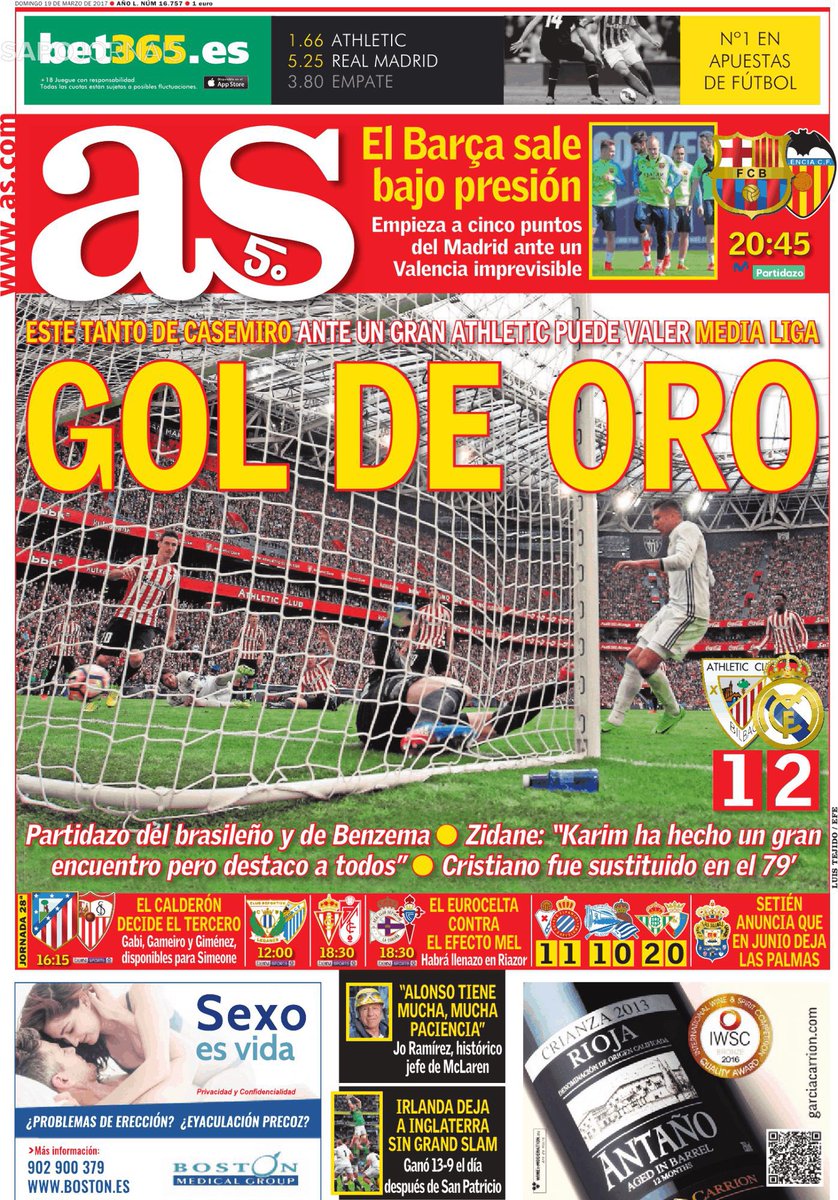 تحدثت الصحف الإسبانية عن فوز ريال مدريد على أتلتيك بلباو الصعب، بالإضافة إلى المباراة الهامة الذي يخوضها برشلونة أمام فالنسيا، اليوم، ويستعرض "بطولات" أبرز عناوين الصحف الإسبانية، لصباح الأحد.
