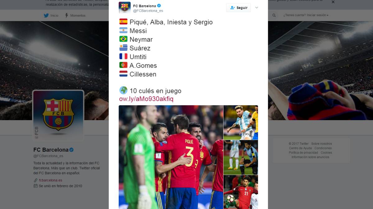 وكان الحساب الرسمي للفريق باللغة الإسبانية، نشر تغريدة تتضمن أسماء لاعبيه المشاركين مع منتخبات بلادهم ما بين المواجهات الودية أمثال جيرارد بيكيه و آندريس إنيستا مع المنتخب الإسباني أمام نظيره الفرنسي، ومواجهات التصفيات المؤهلة لمونديال روسيا 2018.