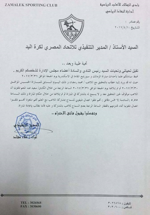 خاطب مسئولو نادي الزمالك، اتحاد كرة اليد، للمطالبة بإعادة مباراة سبورتنج التي أقيمت أمس الجمعة، وذلك بسبب عدم التمكن من إشراك لاعب الفريق محمد رمضان.