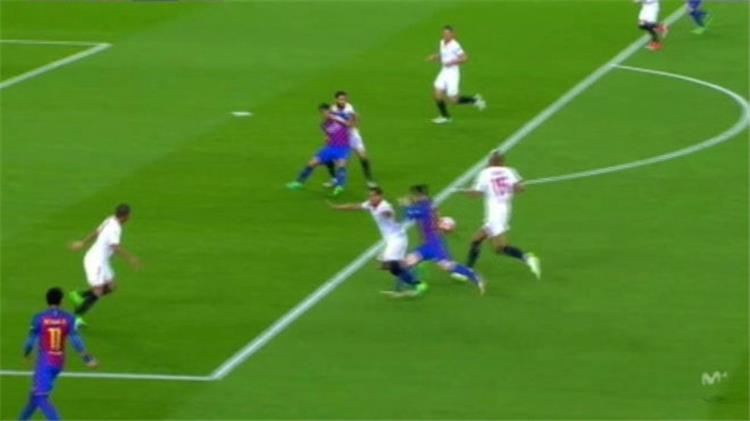 ووضح أن الحالة الأولى جاءت في الدقيقة الثامنة حين تعرض لويس سواريز للجذب من الخلف من جانب باريخا لاعب إشبيليه داخل منطقة الجزاء ومنعه من إستلام الكرة في منطقة الجزاء.