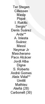 وضمت القائمة اللاعبين المصابين والموقوفين يأتي على رأسهم سيرجو بوسكيتس، وأردا توران، وأليكس فيدال.