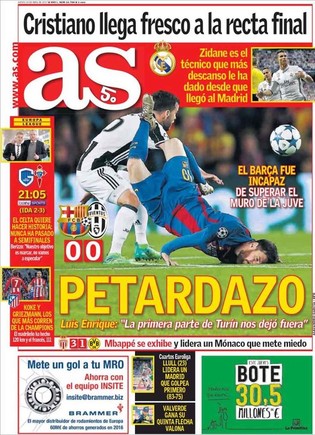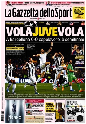 سلطت صحيفتي (سبورت) الكتالونية و (لاجازيتا ديللو سبورت) الإيطالية الضوء على عناوين الصحافة الإسبانية والإيطالية عقب نجاح يوفنتوس في إقصاء برشلونة من الدور ربع النهائب لمنافسات دوري أبطال أوروبا.