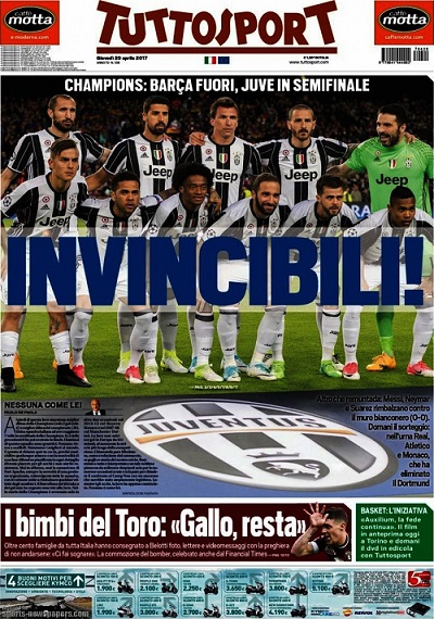 توتو سبورت الإيطالية:" لا يقهر، بارسا خارج، يوفي إلى نصف النهائي".