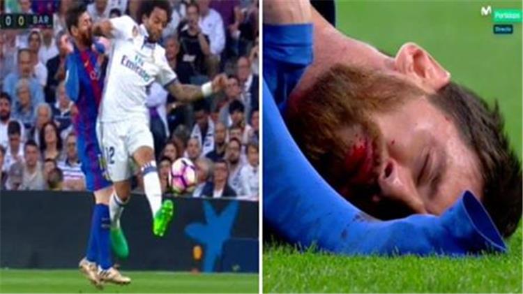 ودخل لاعب ريال مدريد مارسيلو في إلتحام عنيف مع ميسي وأسقطه أرضًا، حيث اصطدم كوع اللاعب البرازيلي بوجه نظيره الأرجنتيني.