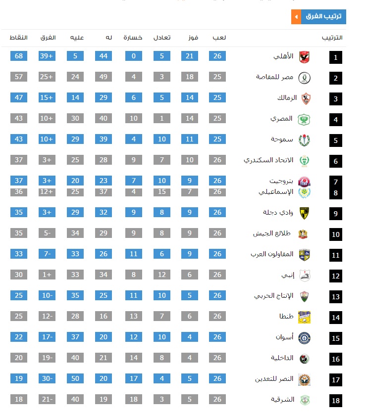 وواصل الأهلي صدارة جدول ترتيب الدوري، برصيد 68 نقطة، ويتوصف مصر للمقاصة برصيد 60 نقطة، ويحل الزمالك ثالثًا برصيد 47 نقطة، بينما يتواجد في المركز الرابع المصري برصيد 43 نقطة، مع مراعاة وجود مباراة مؤجلة للفريق البورسعيدي.