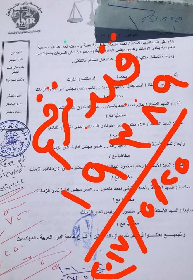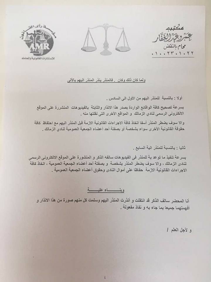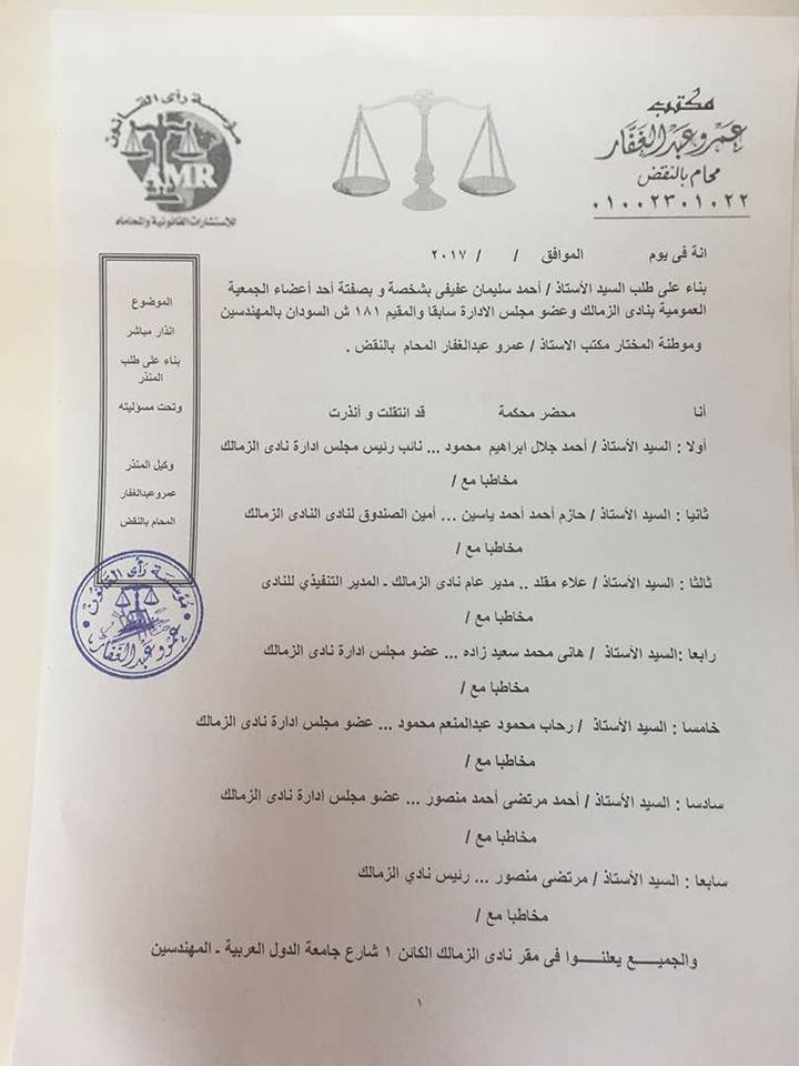 ونشر سليمان، عبر حسابه الشخصي على موقع التواصل الاجتماعي "فيس بوك"، صورًا للإنذار، وعلق قائلاً: "أرسلت اليوم إنذارًا إلى مجلس إدارة نادي الزمالك كلا بصفته للحفاظ على أموال وحقوق أعضاء الجمعية العمومية ورد كل منهم في الاتهامات التي وجهت لي من رئيس النادي في وجودهم كما هو واضح في بعض الفيديوهات".