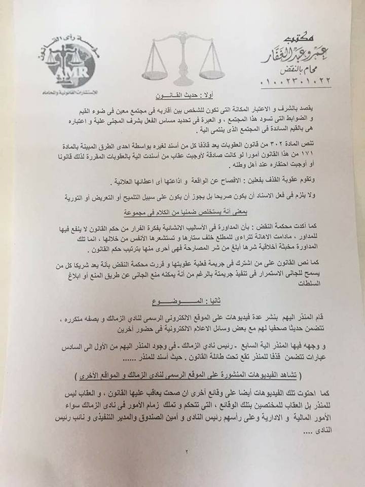 أرسل أحمد سليمان، عضو مجلس الزمالك السابق، اليوم الخميس، إنذارًا على يد محضر محكمة، لإدارة القلعة البيضاء، بسبب الاتهامات التي وجهها له مرتضى منصور رئيس النادي، في الجمعية العمومية الأخيرة أمام الأعضاء.