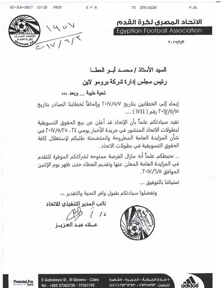 وكانت الوكالة تقدمت ببلاغ رسمي إلى النائب العام في وقت سابق، بعدما تجاهل اتحاد الكرة العرض المُقدم من جانبهم لشراء حقوق مباراتي المنتخب المصري أمام أوغندا والكونجو في تصفيات كأس عالم 2018 بـ25 مليون جنيه.