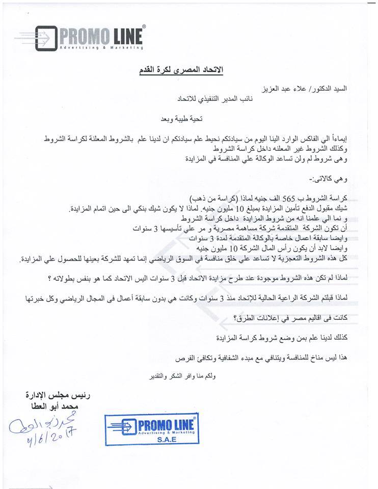 سخرت وكالة "برومو لاين" للإعلان والتسويق الرياضي من الشروط التي وضعها اتحاد الكرة المصري، للمزايدة الخاصة بشراء حقوق البطولات التي تُنظم تحت لواء الاتحاد المصري.