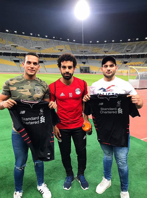 التقطت العدسات صورة لمحمد صلاح مهاجم المنتخب الوطني مع معجبين يحملان قميص "ليفربول".