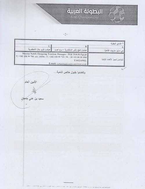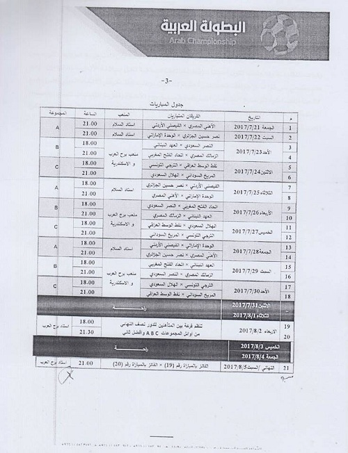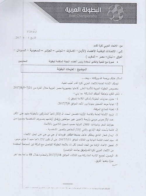 تلقى الاتحاد المصري لكرة القدم من نظيره العربي جدول البطولة العربية، وكل ما يخصها من لوائح.