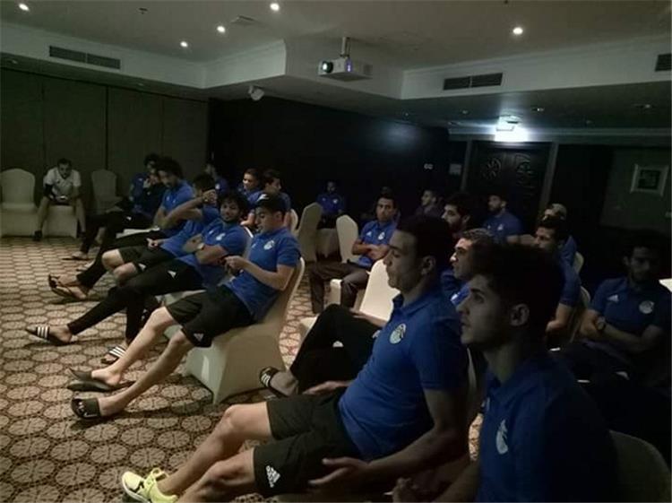 تجمع لاعبو منتخب مصر الأول، في قاعة المحاضرات داخل فندق الإقامة ببرج العرب، إذ يلقي عليهم المدير الفني الأرجنتيني هيكتور كوبر، محاضرة بالفيديو.