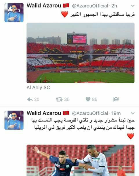 كشف المهاجم المغربي، وليد أزارو، لاعب الدفاع الحسني الجديدي، المنتقل حديثًا إلى النادي الأهلي، عن حبه الشديد إلى القلعة الحمراء وجماهيره.
