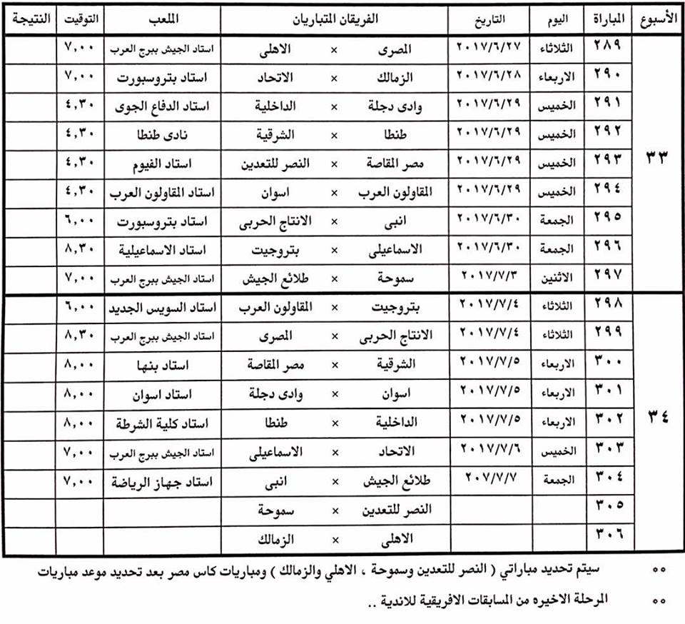 أعلنت لجنة المسابقات بالاتحاد المصري لكرة القدم، برئاسة عامر حسين، مواعيد وأماكن مباريات الأسبوعين 33 و 34 من مسابقة الدوري الممتاز.