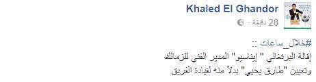 وقال الغندور، على حسابه الخاص بموقع التواصل الاجتماعي "فيس بوك": "خلال ساعات، إقالة البرتغالي إيناسيو المدير الفني للزمالك، وتعيين طارق يحيى بدلآ منه لقيادة الفريق".