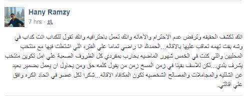 وكتب هاني، عبر حسابه الشخصي على "فيسبوك": "إنك تكشف الحقيقة وترفض عدم الاحترام والإهانة، وإنك تعمل باحترافية وإنك تقول للكذاب أنت كذاب في وشه، بقت تهمه تعاقب عليها بالإقالة".