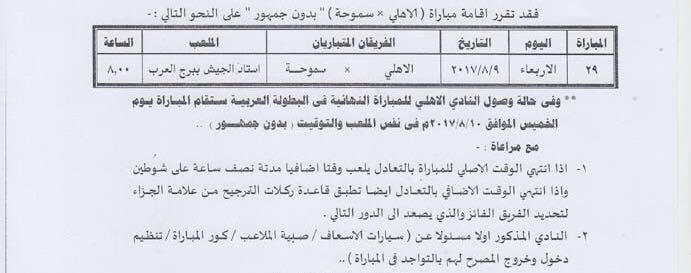 وفي حالة وصول الأهلي إلى النهائي العربي، فسيتم تأجيل اللقاء 24 ساعة، ليقام يوم 10أغسطس.