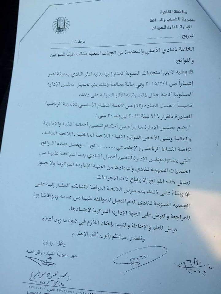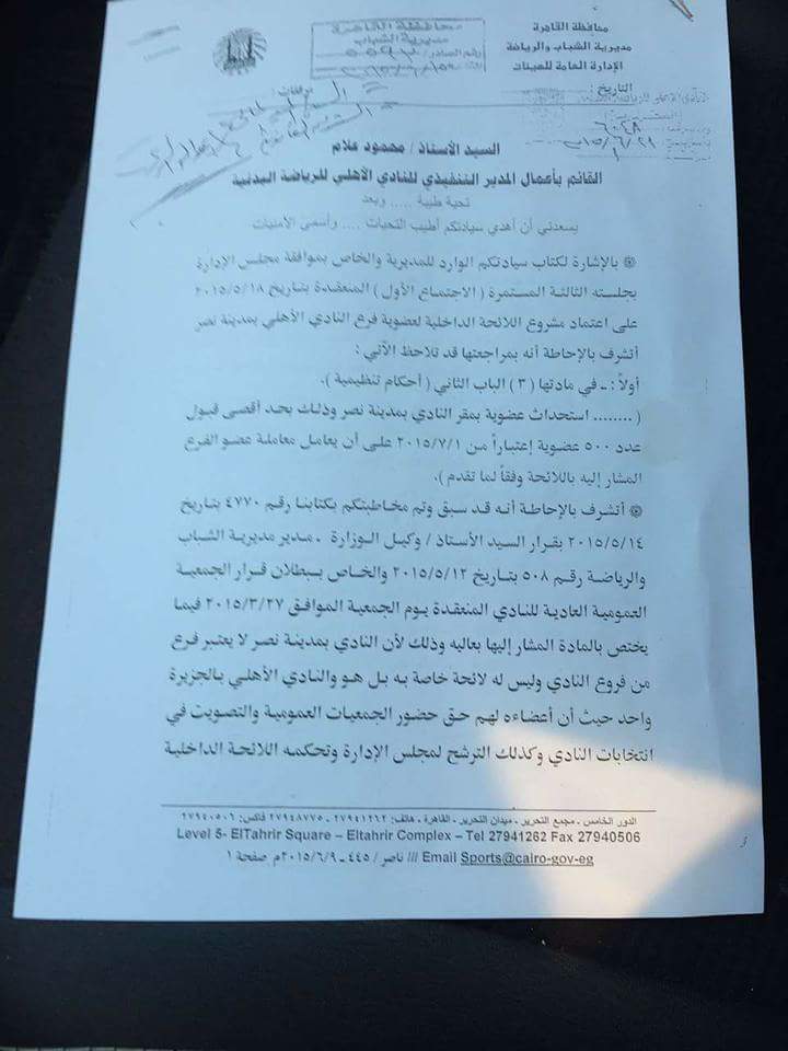 وأشار إلى إن خطاب الجهة الإدارية جاء ردا على طلب مسئولي الأهلي الحصول على موافقة لعمل عضويات بمدينة نصر منفرداً، الإ أن مديرية الشباب والرياضة رفضت وأكدت أن الجزيرة ومدينة نصر مقرًا واحدًا.