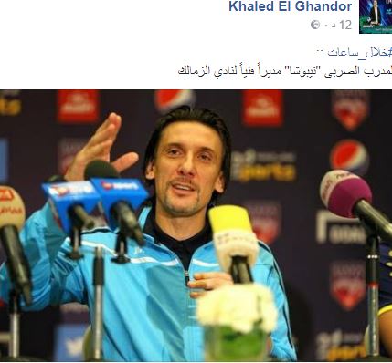 وقال الغندور عبر حسابه الرسمي بموقع التواصل الاجتماعى "فيس بوك": "خلال ساعات المدرب الصربي نيبوشا، مديراً فنياً للزمالك".