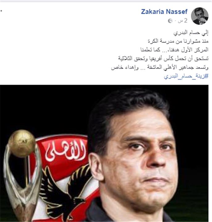 ونشر ناصف، على حسابه الخاص عبر موقع التواصل الاجتماعي "فيس بوك": "إلى حسام البدري، منذ مشوارنا من مدرسة الكرة، المركز الأول هدفنا، كما تعلمنا".