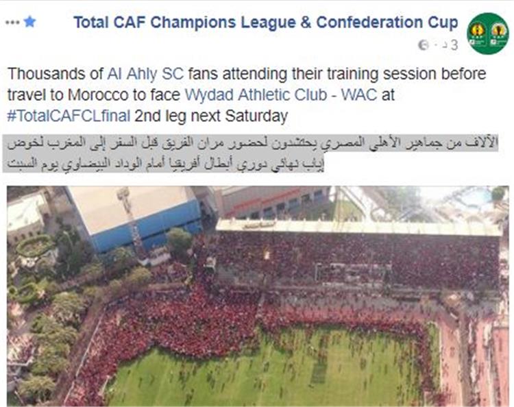 وكتب الكاف عبر حسابه الخاص، على موقع التواصل الاجتماعي "فيس بوك": "الآلاف من جماهير الأهلي المصري يحتشدون لحضور مران الفريق قبل السفر إلى المغرب، لخوض إياب نهائي دوري أبطال إفريقيا أمام الوداد البيضاوي يوم السبت".
