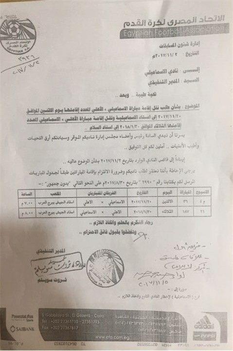 أرسل مسئولو اتحاد الكرة، خطابًا رسميًا لنظرائهم في الإسماعيلي، يفيد برفضهم نقل مباراة "الدراويش" أمام الأهلي، إلى ملعب استاد الإسماعيلية.
