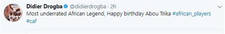 ونشر دروجبا على حسابه الخاص، عبر موقع التواصل الاجتماعي "تويتر": "عيد ميلاد سعيد يا أبوتريكة، أسطورة أفريقية لم يتم تقديرها بشكل مناسب".